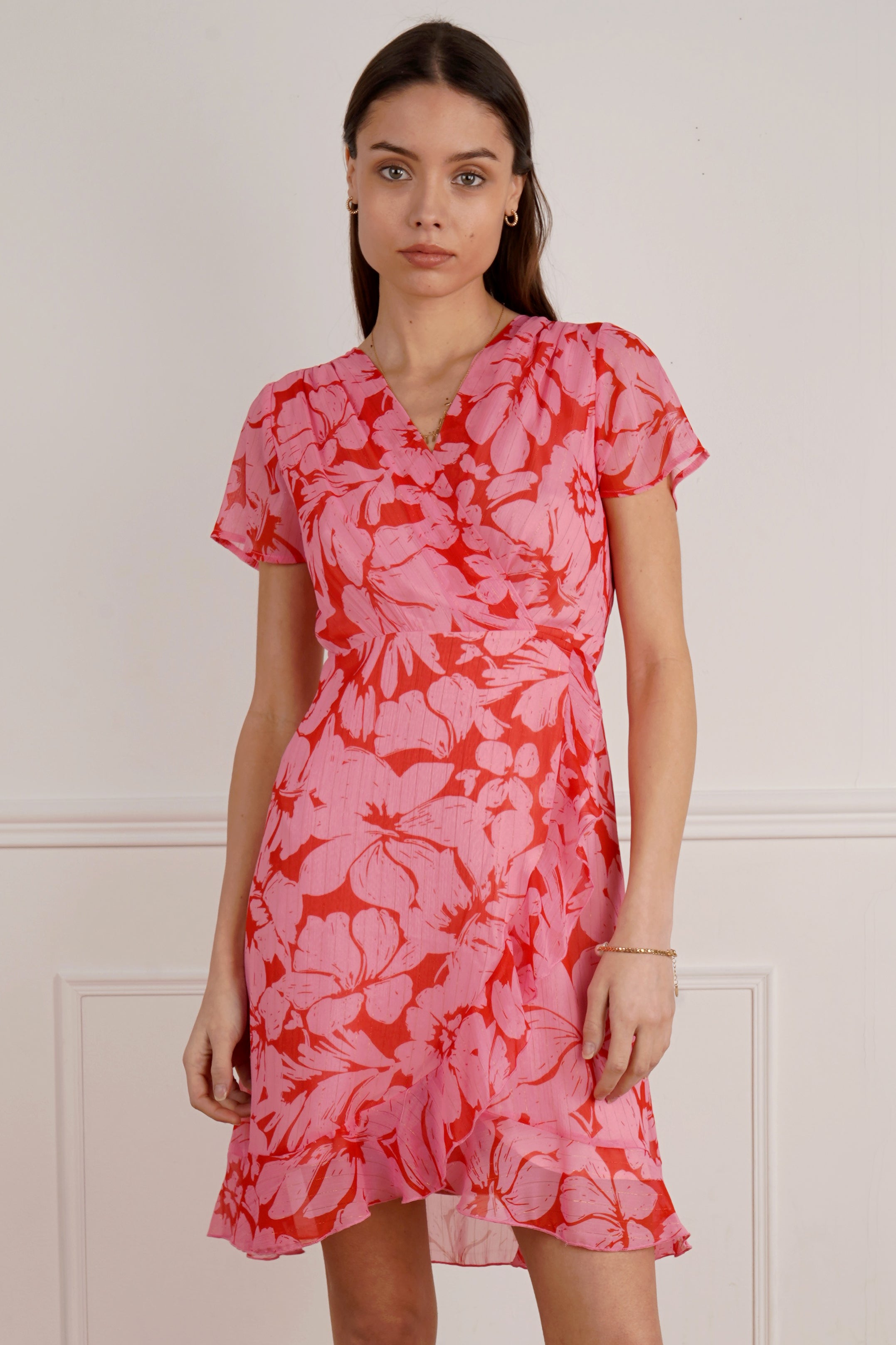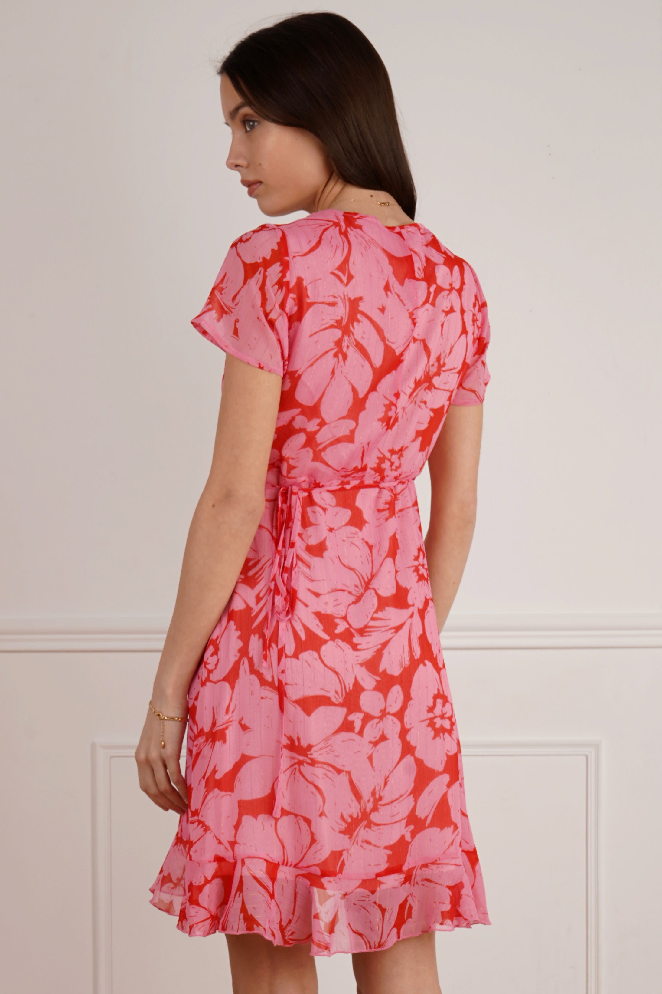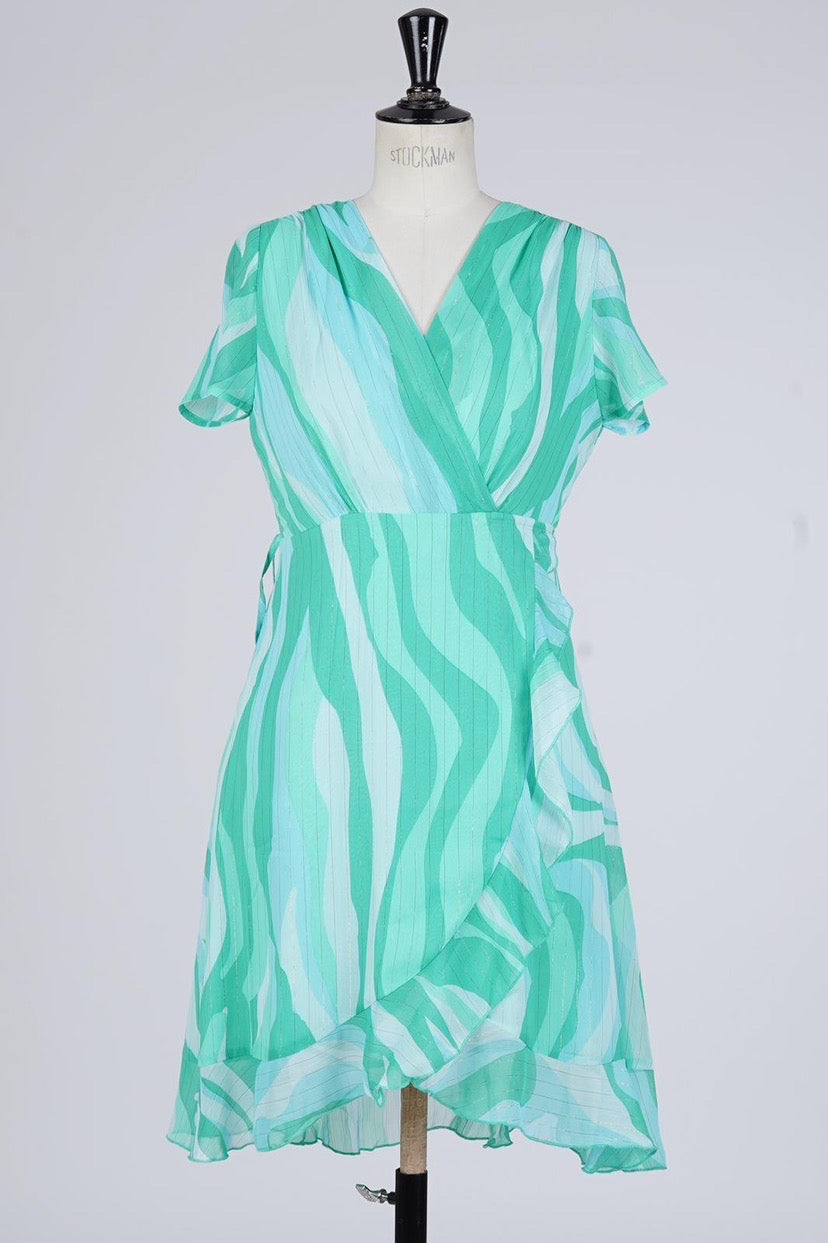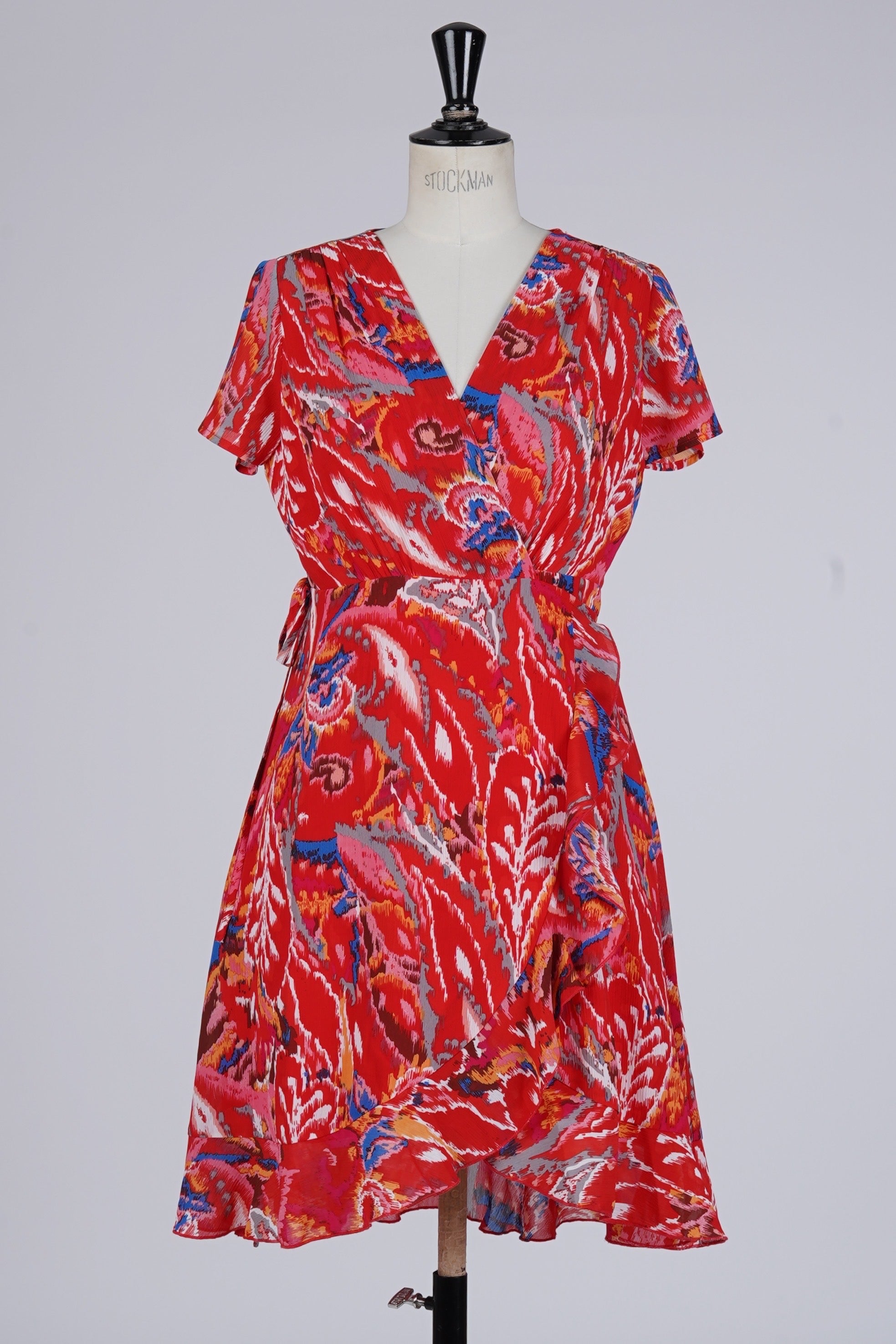 • Short wrap-over dress decorated with ruffles at the bottom of the dress