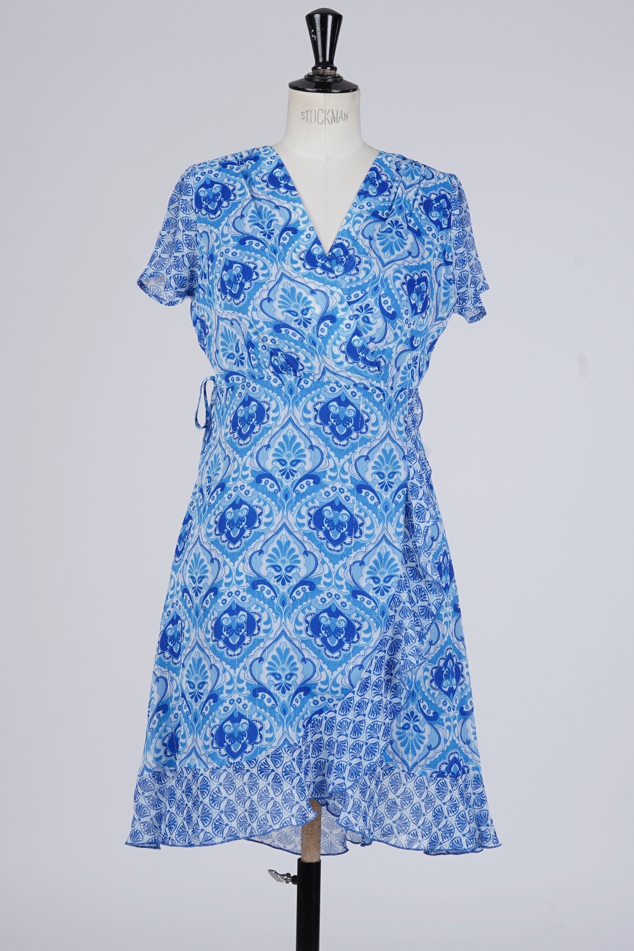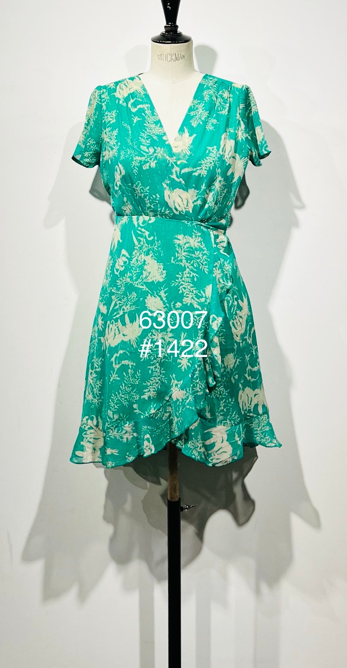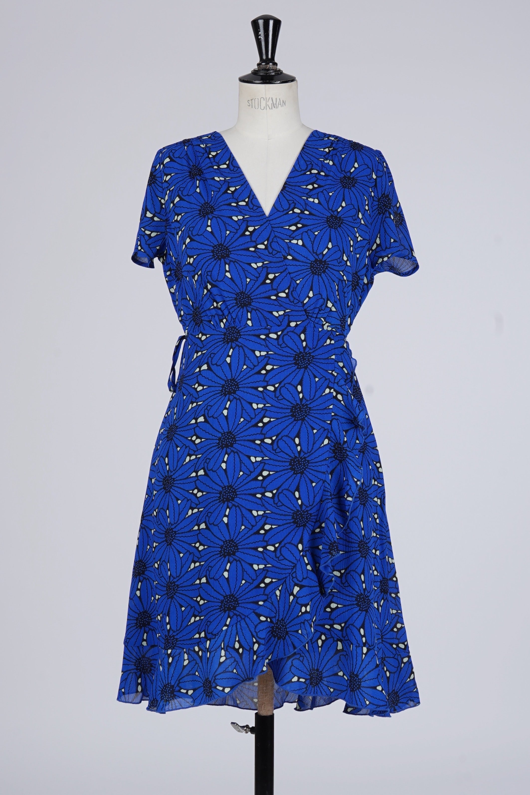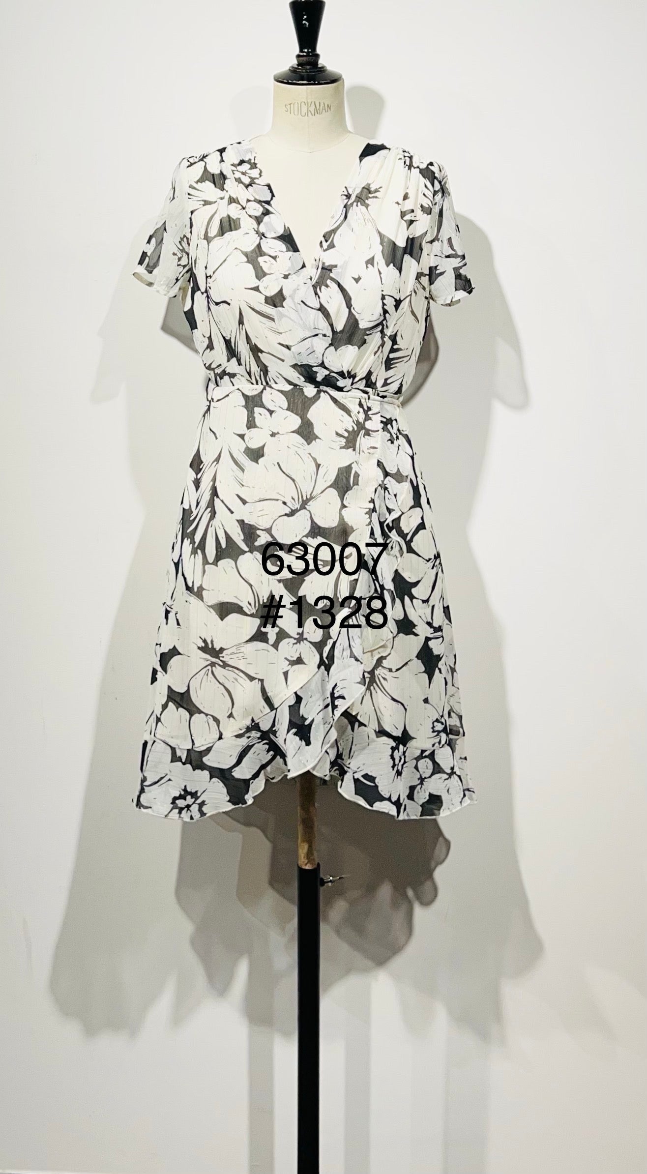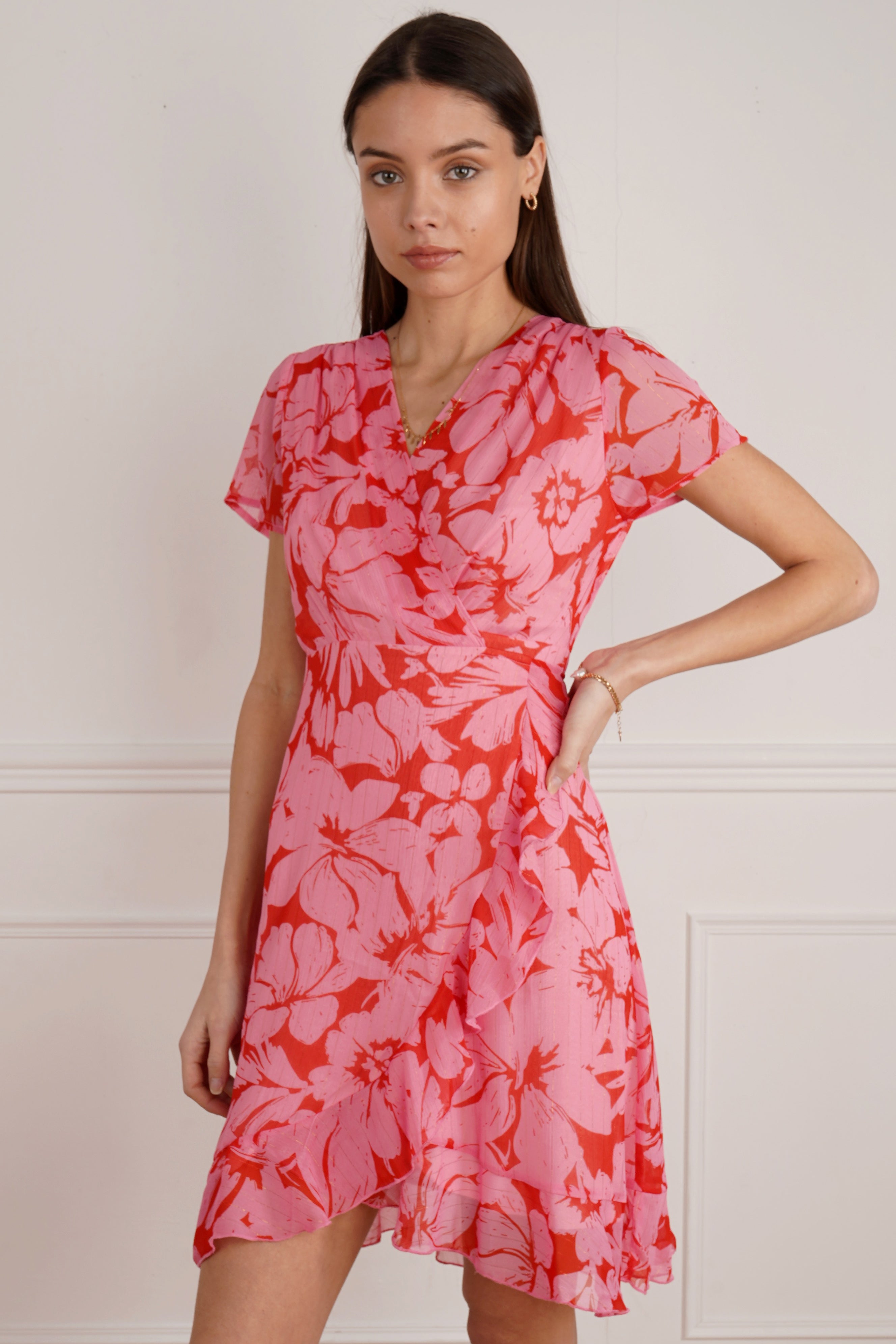 • Short wrap-over dress decorated with ruffles at the bottom of the dress
