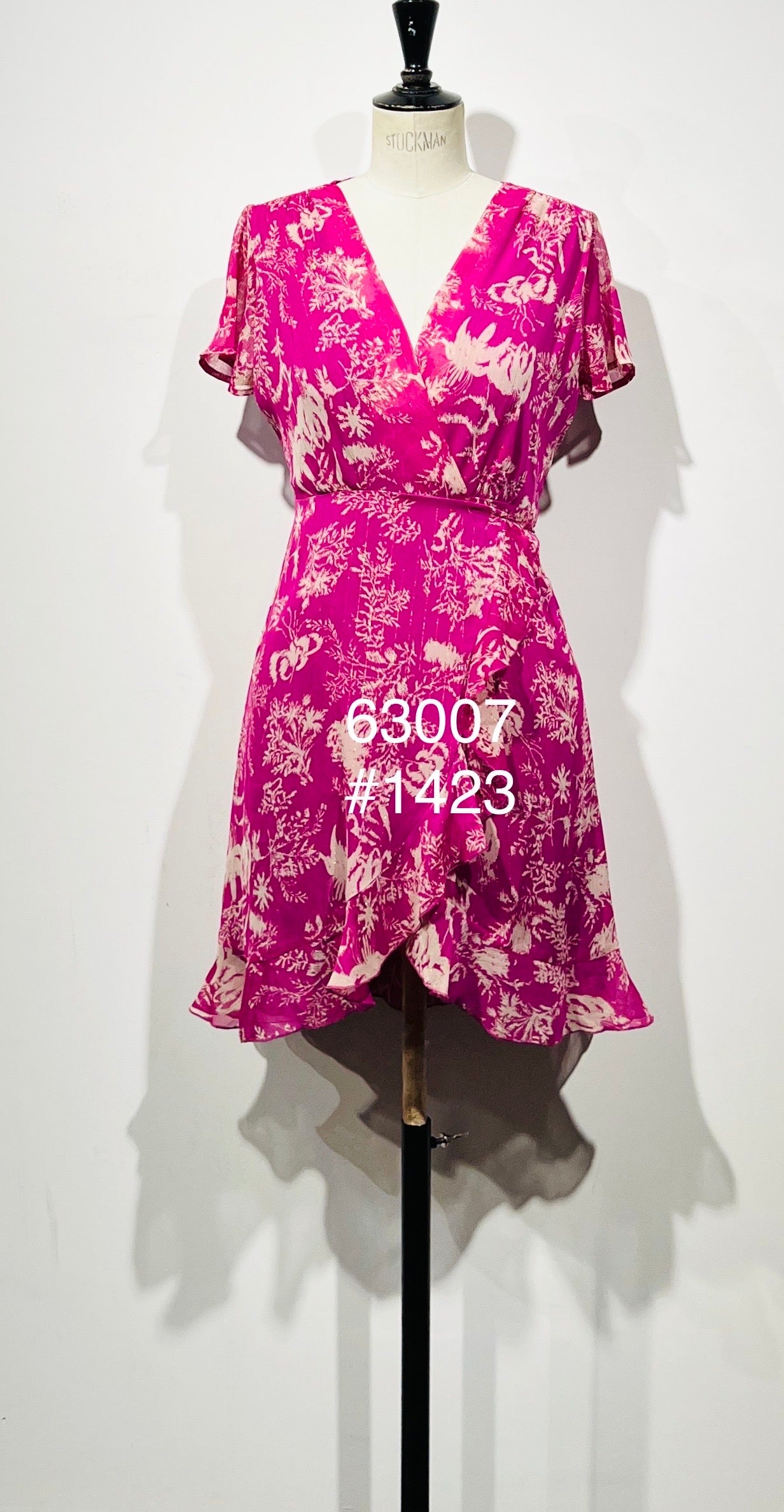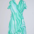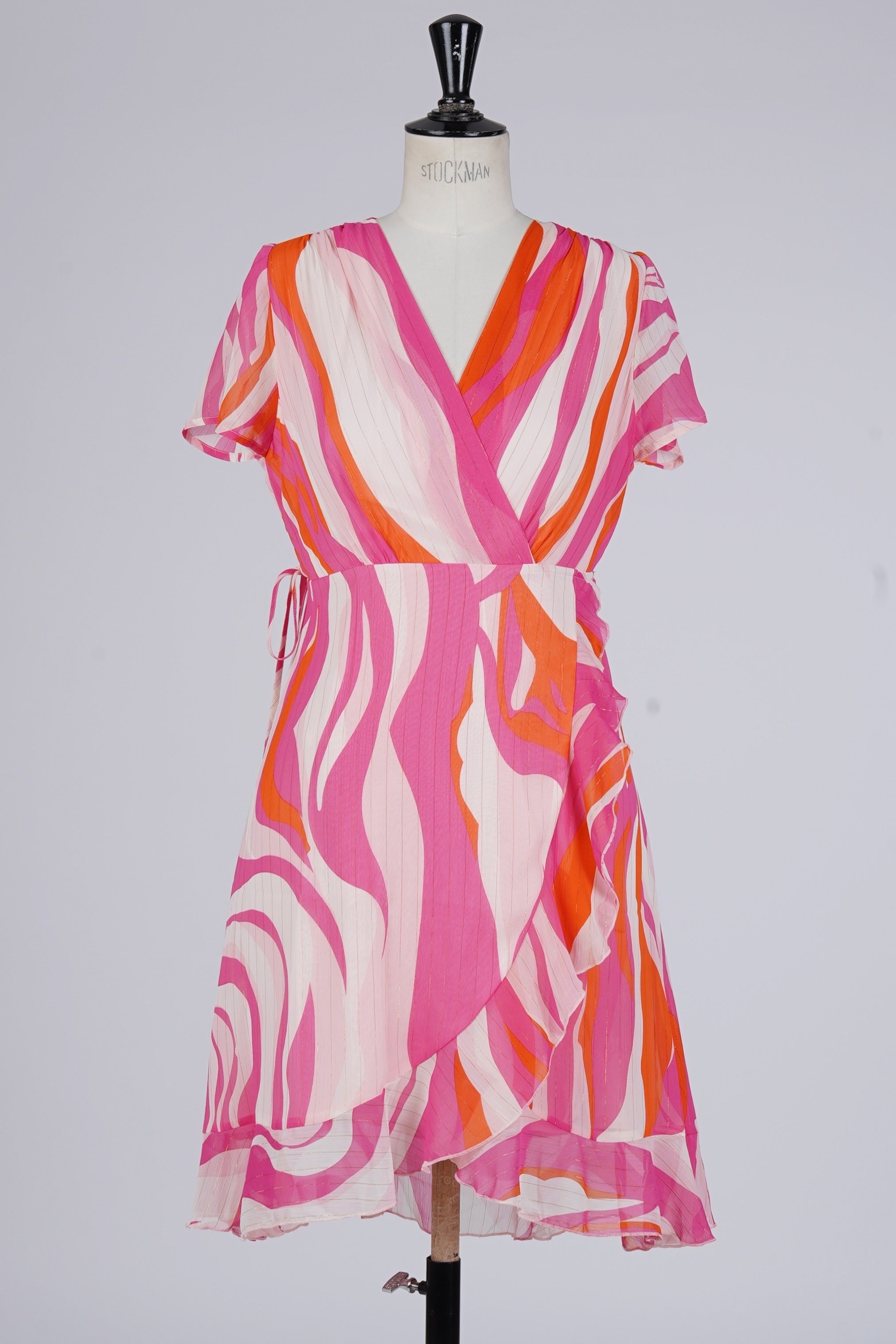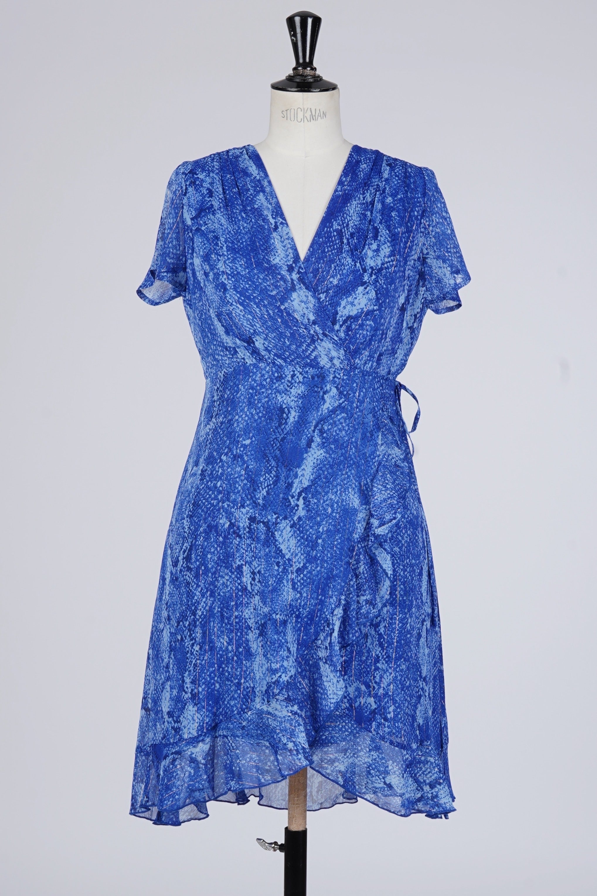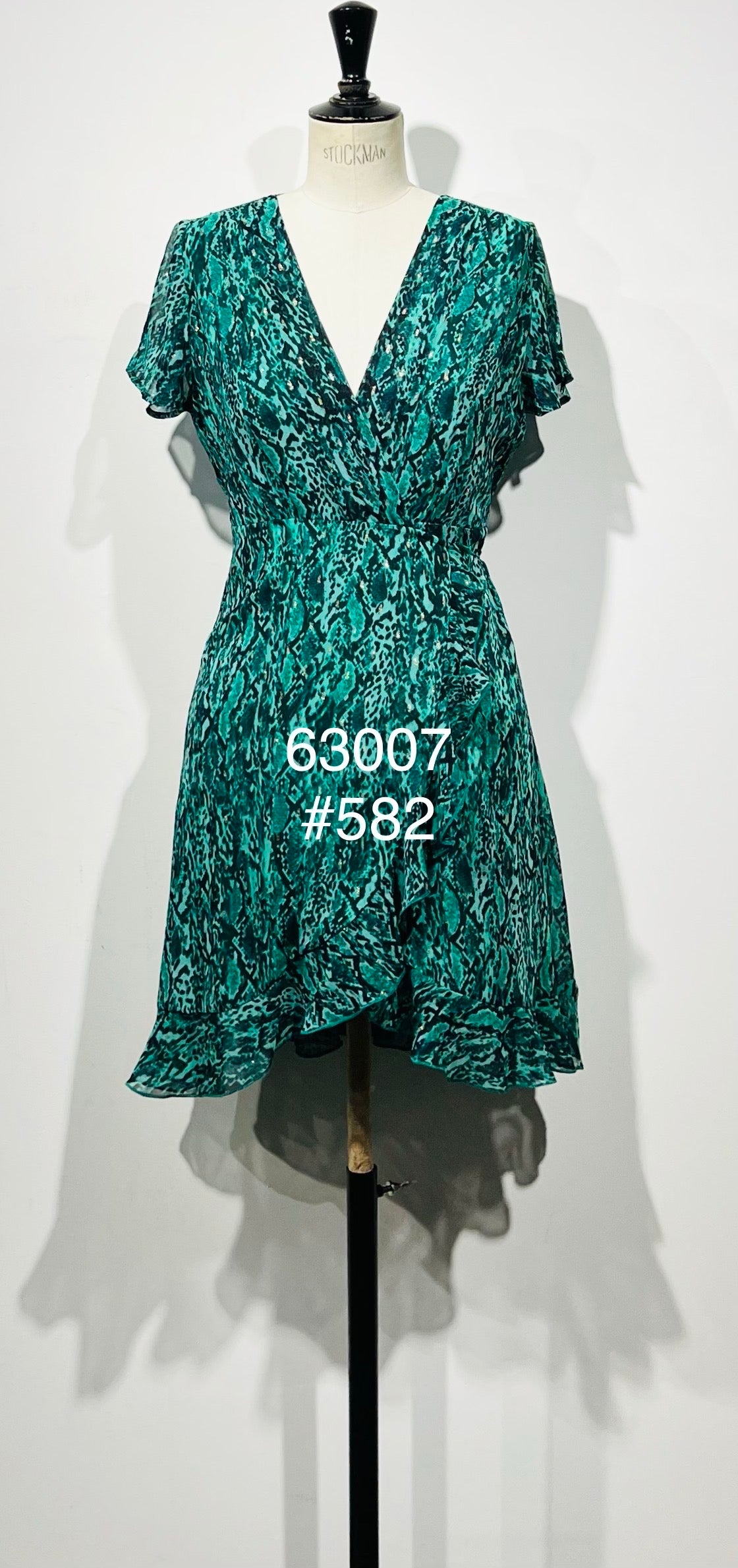 • Short wrap-over dress decorated with ruffles at the bottom of the dress