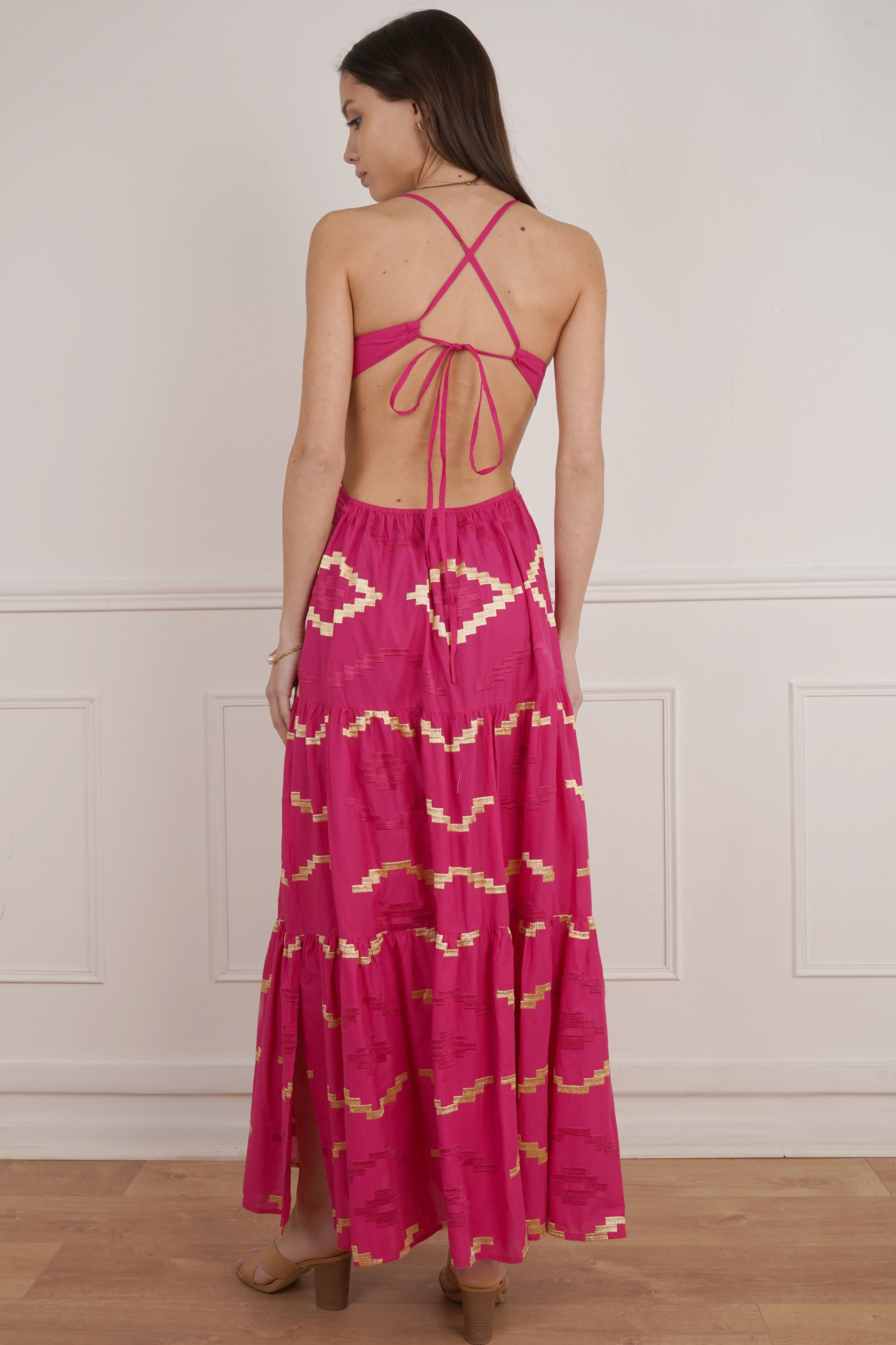 - Chest held and adjusted by ties at the back of the dress