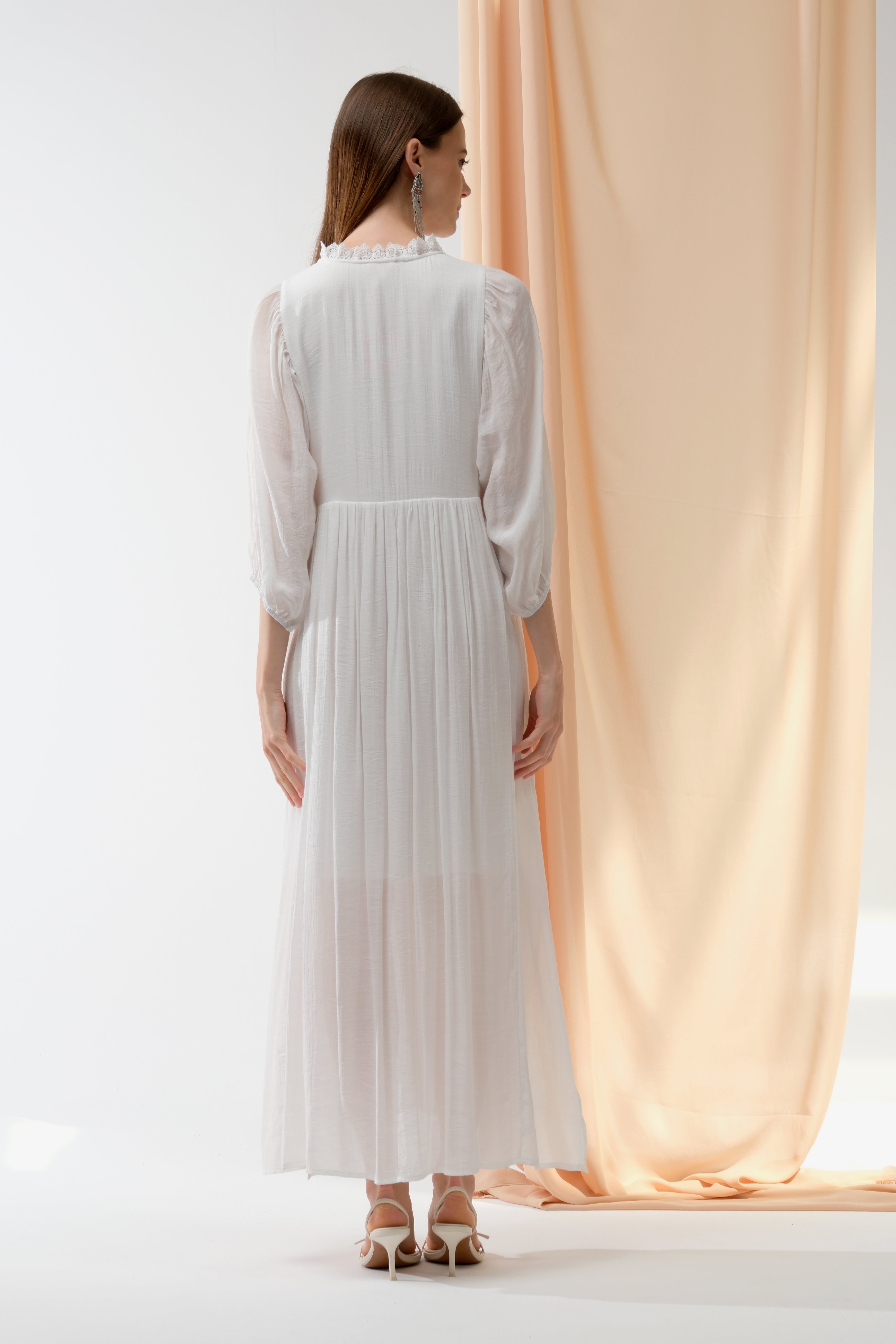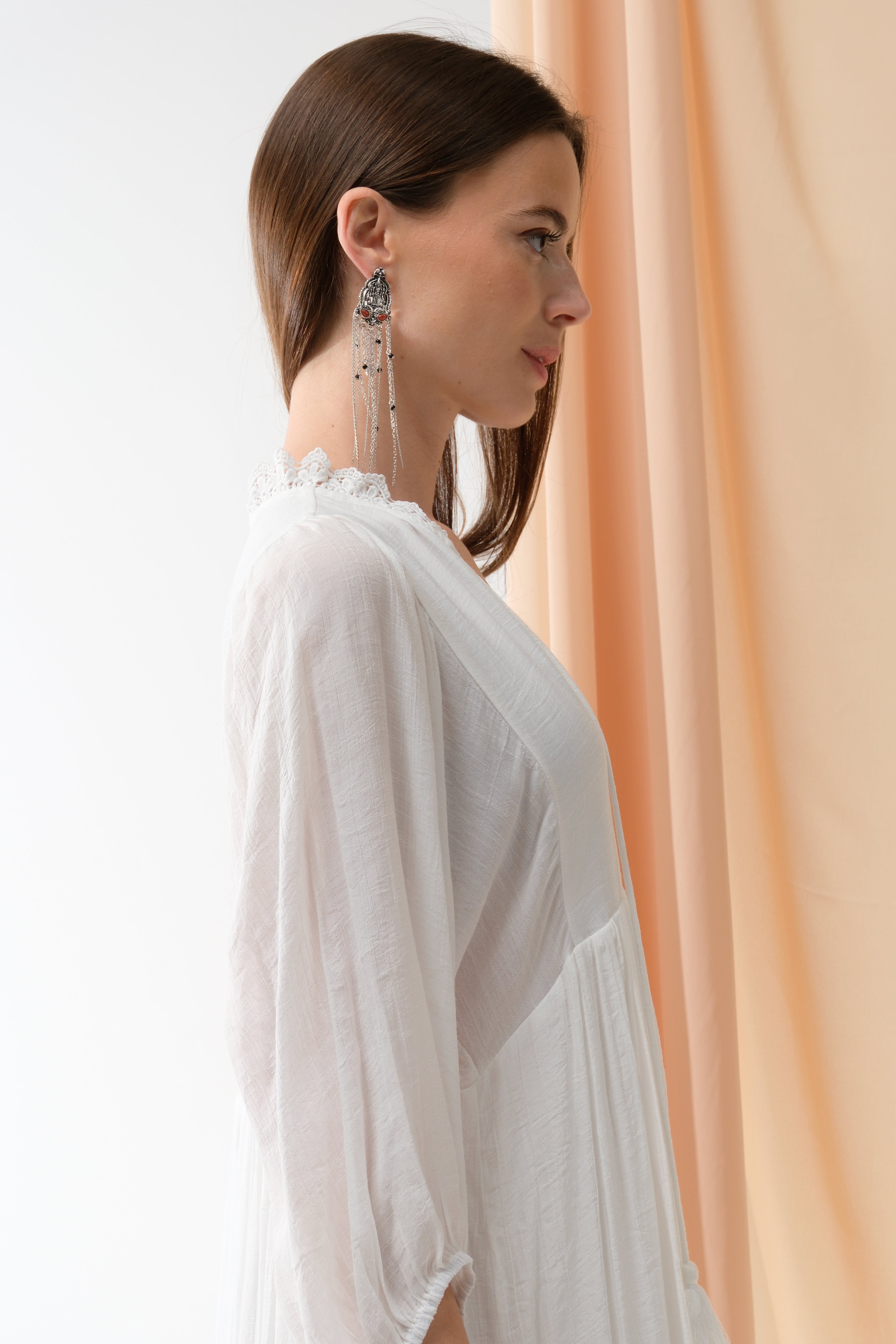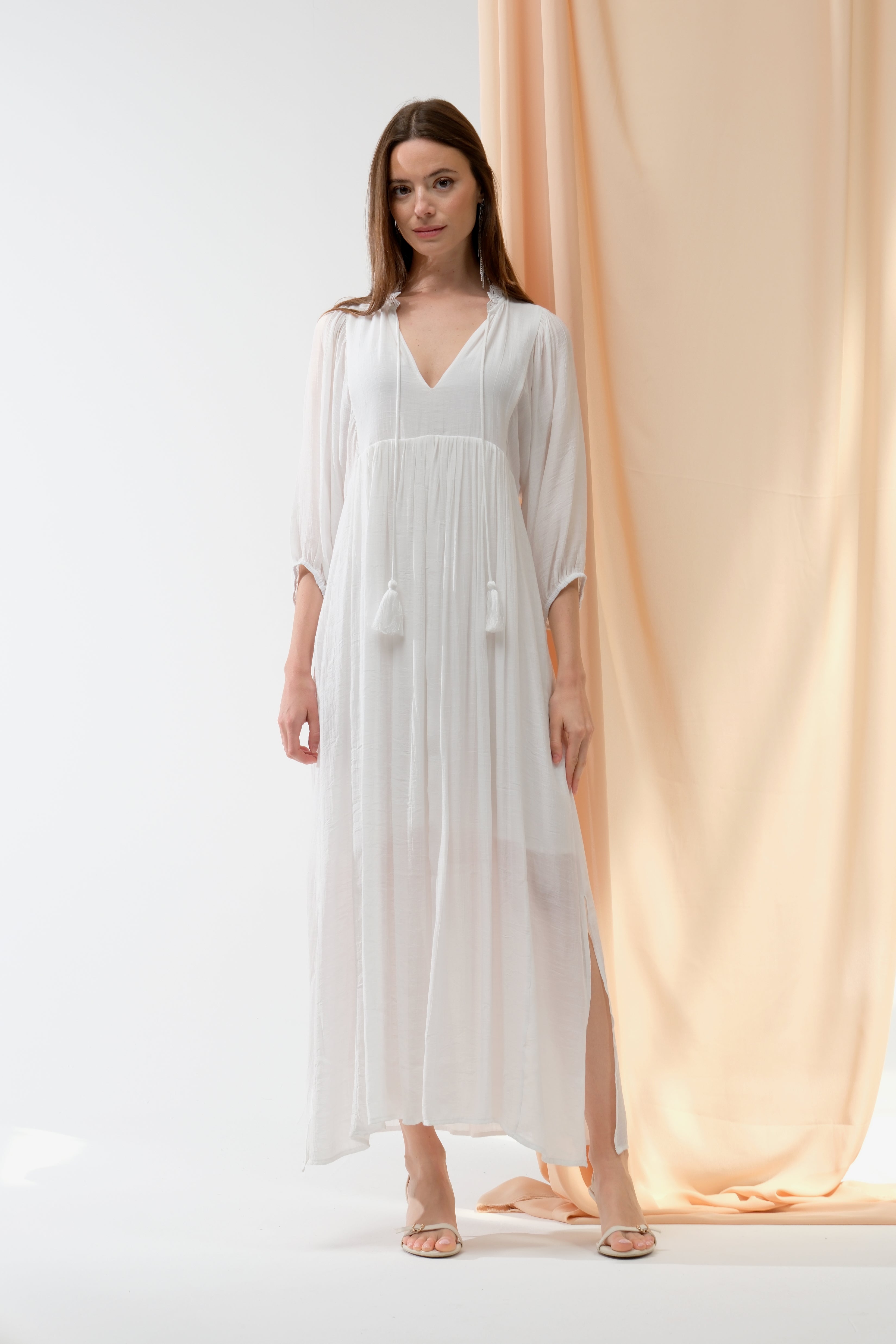 Cette robe longue en viscose incarne l'élégance bohème par excellence. Sa coupe fluide, son décolleté en V et son jeu de liens ornés de pompons apportent une touche légère et féminine. Les manches trois-quarts et la fente sur le bas lui confèrent un mouvement aérien, parfait pour les journées ensoleillées ou les soirées d'été.