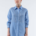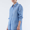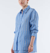 Fall for the charm of Ice, an oversized shirt that combines comfort and elegance. The silky quality of the blouse features delicate metallic stripes that subtly illuminate the silhouette. Perfect for creating a casual-chic look, Ice can be worn with our matching pants or with jeans or shorts for a more casual style.