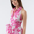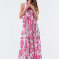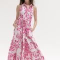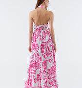 Here's a favorite piece! Lucanda is a long dress with flamboyant prints, hand-embroidered with jewels. Its halter-style shirt collar and fabric belt, which ties at the front or back, delicately accentuate the silhouette, while its generously voluminous skirt ensures a decidedly feminine look.
