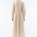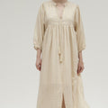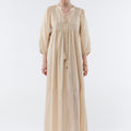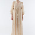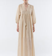 Meet our little gem, Sacha, a maxi dress subtly accented with fine lurex stripes. Its puffed sleeves and tie-front neckline add a bohemian touch, while the loose fit and side slits ensure ease of movement, perfect for sunny days or summer evenings.