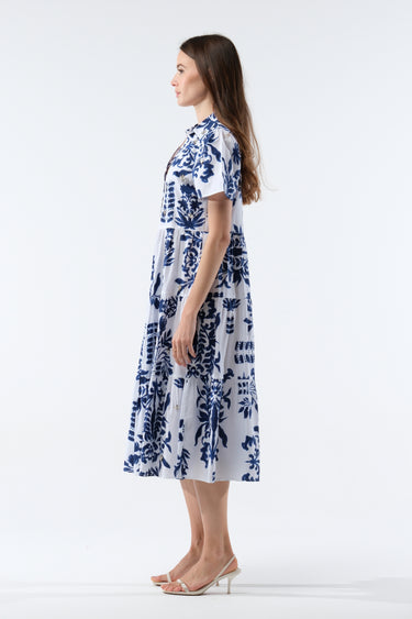 Lia is a mid-length cotton poplin shirt dress, enhanced with delicate hand-embroidered jewels. Its short sleeves, classic collar, and tiered skirt give it a timeless look, while its refined embroidery adds a precious, artisanal touch. Both elegant and comfortable, Lia is perfect for everyday wear and dressier occasions.