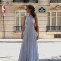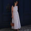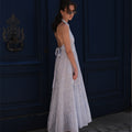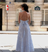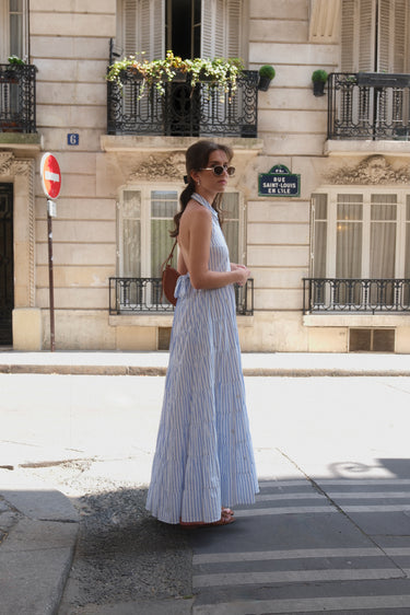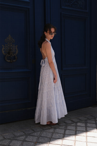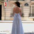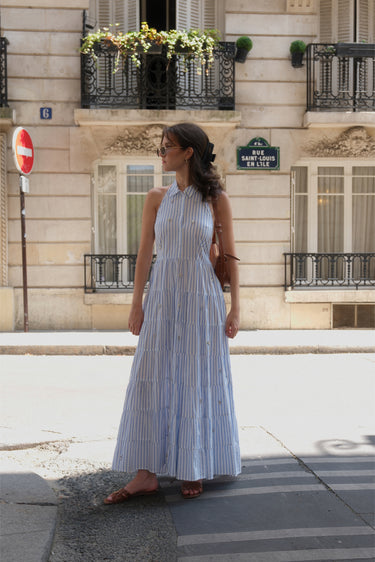 La robe Lucianda est une pièce solaire et moderne. Confectionnée en popeline de coton, elle se distingue par son col chemise revisité et son dos nu à nouer, qui sublime la silhouette. La ceinture assortie se noue à l’avant ou à l’arrière selon vos envies, pour souligner la taille avec délicatesse. Des broderies de perles réalisées à la main viennent magnifier l’ensemble avec subtilité. Sa jupe longue à étages crée un volume XXL aérien, parfait pour une allure fluide et féminine.