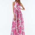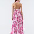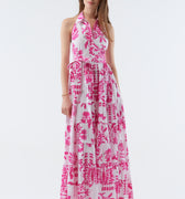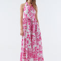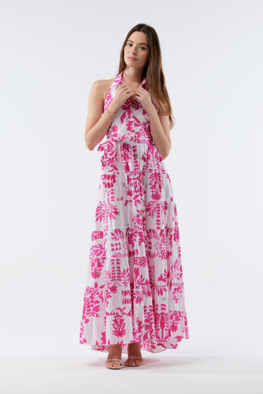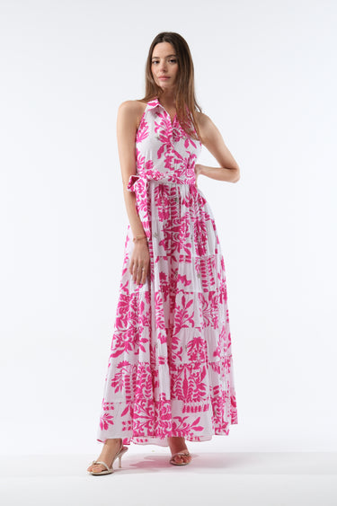Here's a favorite piece! Lucanda is a long dress with flamboyant prints, hand-embroidered with jewels. Its halter-style shirt collar and fabric belt, which ties at the front or back, delicately accentuate the silhouette, while its generously voluminous skirt ensures a decidedly feminine look.