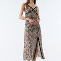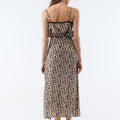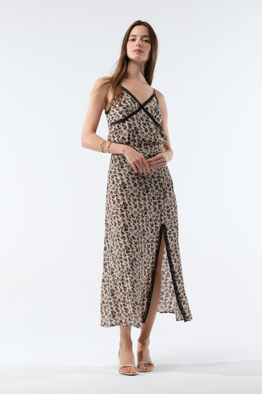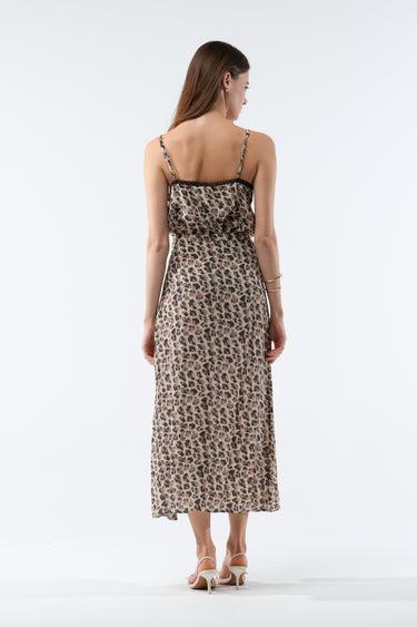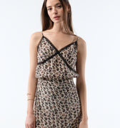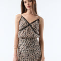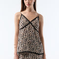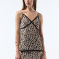 Embrace a bold yet elegant style with Meri, a flowing camisole featuring a leopard print and beautiful lace trim. Its lightweight silhouette and thin straps make it the perfect piece to enhance any outfit.