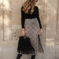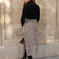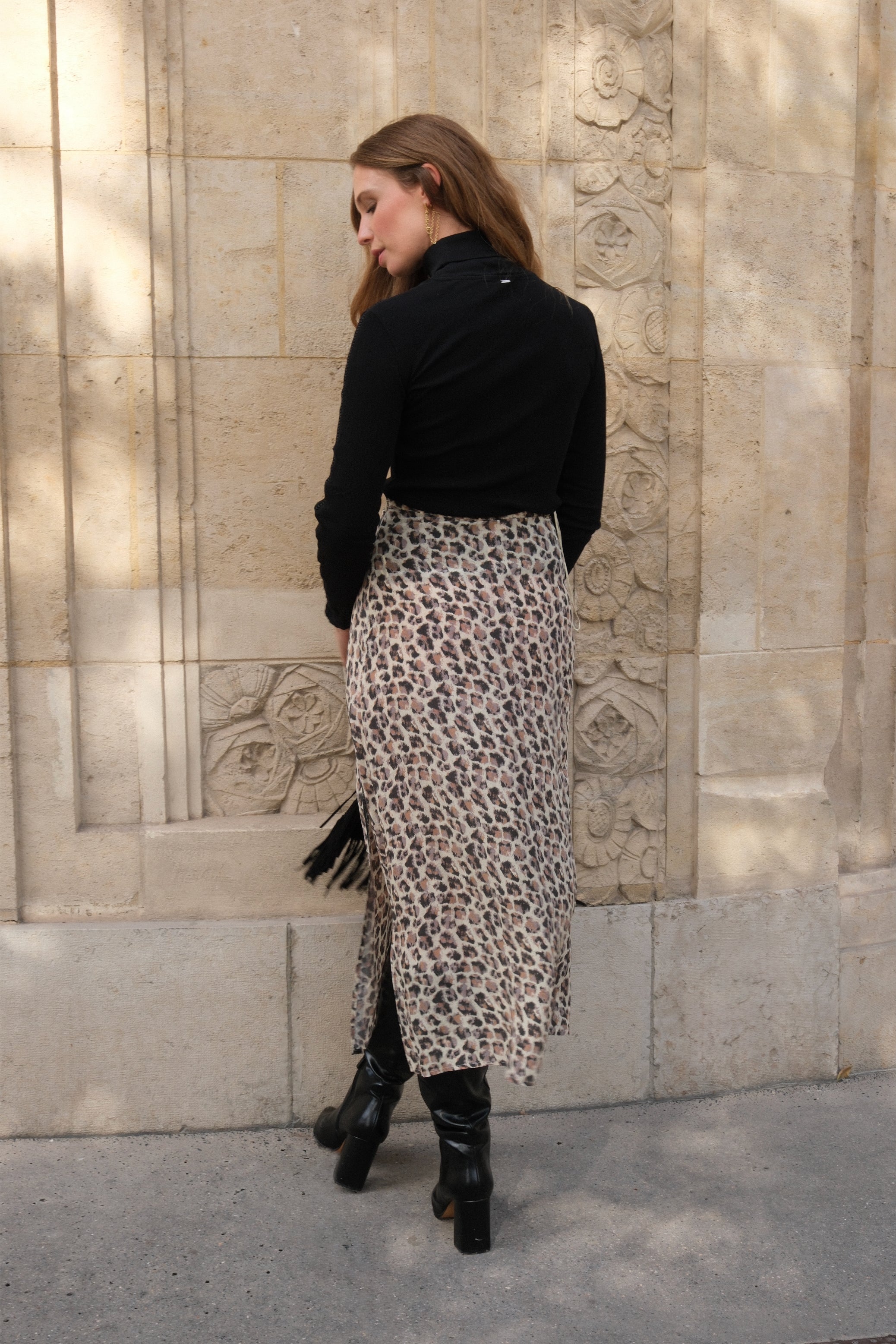 Opt for Tissia, a midi skirt that perfectly combines elegance and boldness thanks to its leopard print and lace-trimmed slit. Crafted from viscose crepe, it offers a fluid and comfortable silhouette, ideal for adding character to your outfits, day or night.