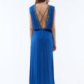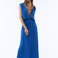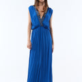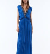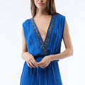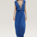 Pana is a long viscose crepe dress embroidered with hand-embroidered beads, making each piece unique. Its deep V-neckline and crossover back delicately accentuate the silhouette, while the flowing cut and gathered waist enhance femininity.