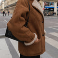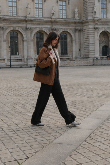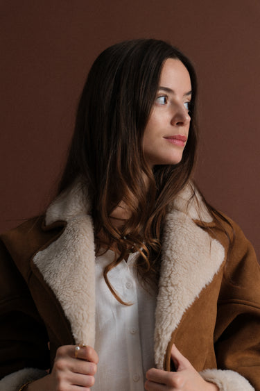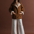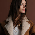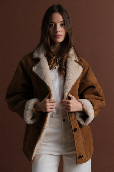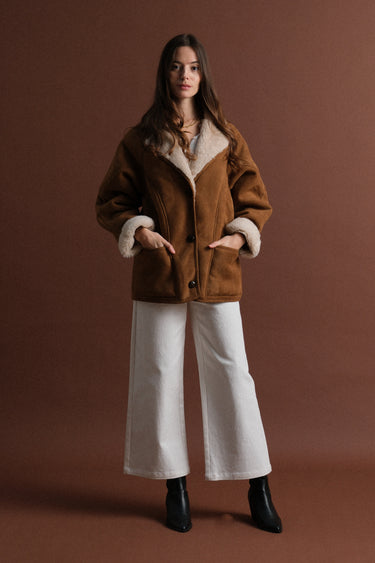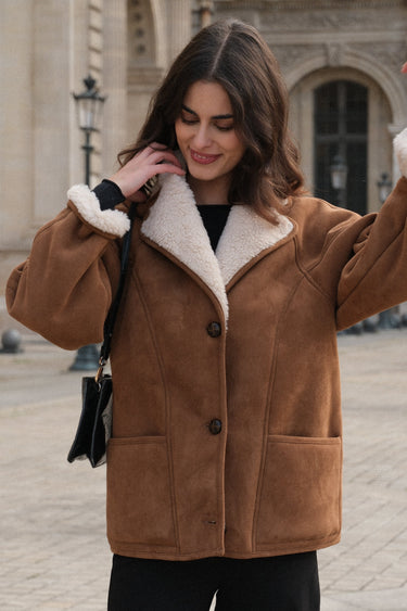 Le manteau 63826 incarne la chaleur et le raffinement de l’hiver. Confectionné dans un effet daim camel et doublé d’une fausse laine crème ultra douce, il enveloppe la silhouette d’une allure à la fois chic et décontractée. C'est la pièce phare pour la saison froide.