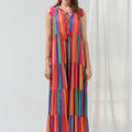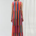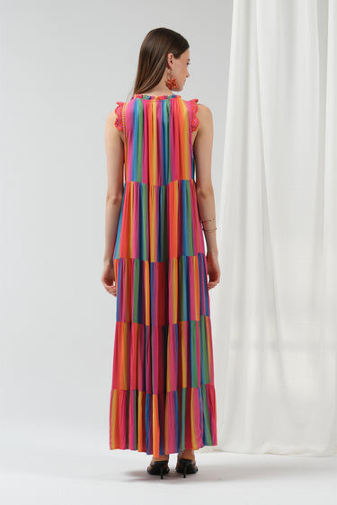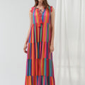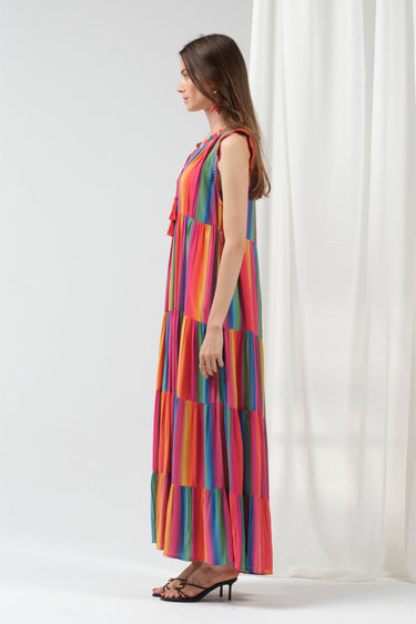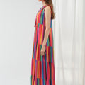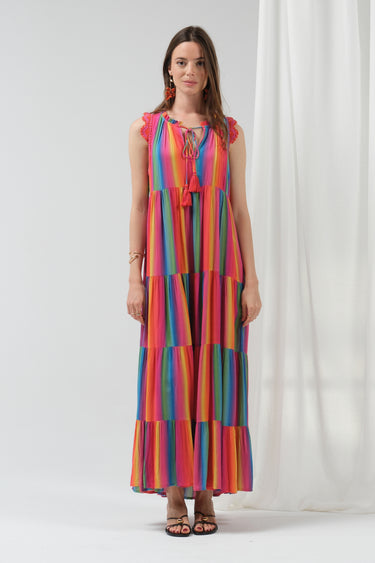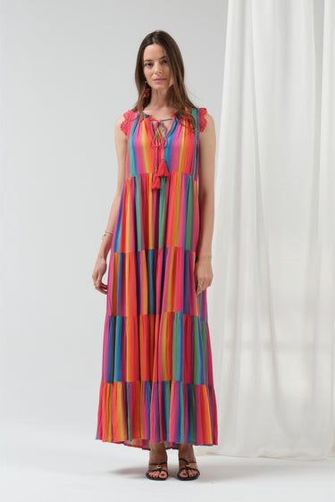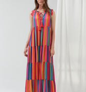 Adoptez un style vibrant et romantique avec la robe longue Maxine, confectionnée dans une viscose fluide aux rayures multicolores. Ce modèle iconique séduit par son ampleur, ses volants en cascade et ses finitions délicates. Une robe idéale pour les journées ensoleillées, les escapades estivales ou un look bohème chic en toute légèreté.