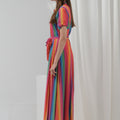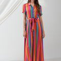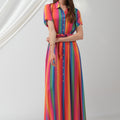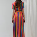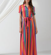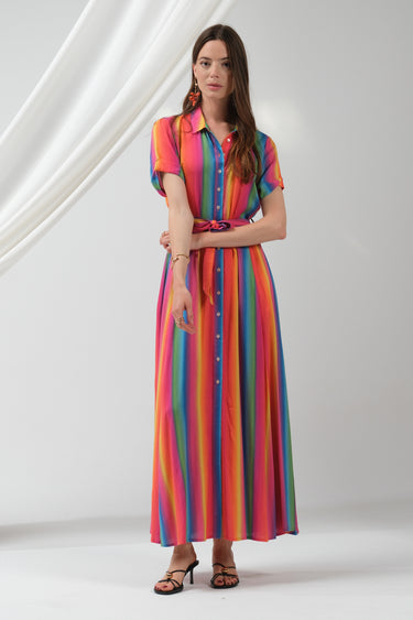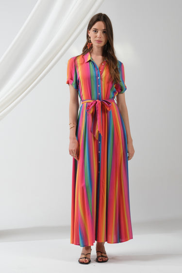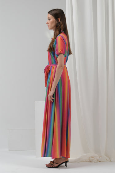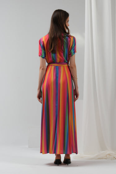 La robe Blanche allie la structure classique d’une robe chemise à l’imprimé arc-en-ciel. Fluide, légère et ceinturée à la taille, elle sublime toutes les silhouettes avec élégance.