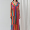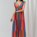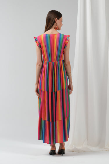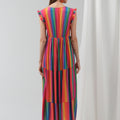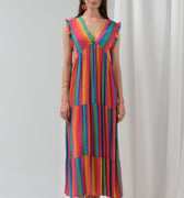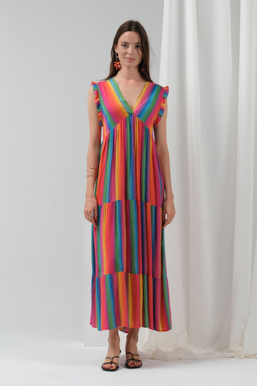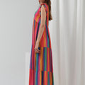 Adoptez l’allure solaire et joyeuse de la robe Estelle, une pièce forte et fluide à l’imprimé arc-en-ciel. Confectionnée en viscose, elle offre un tombé aérien, parfait pour les beaux jours ou un événement estival. Son jeu de rayures multicolores et sa coupe longue ultra-féminine illuminent la silhouette.