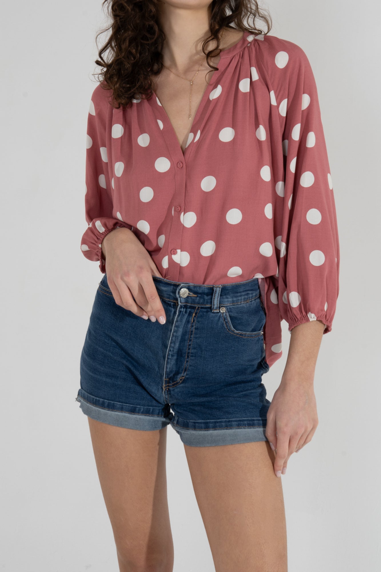 - Blouse with buttonhole all along for a practical and aesthetic closure.