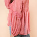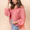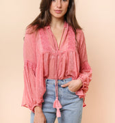 - Coco blouse, long sleeves, decorated with lace, V-shaped collar with fabric cords with pompoms.