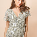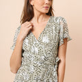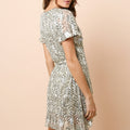 - Short wrap dress to tie at the waist, printed with silver lurex, short sleeves with ruffles.