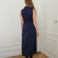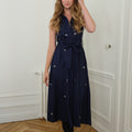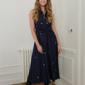 Enhance your summer wardrobe with our midi-length shirt dress, featuring a captivating hand-embroidered detail. Crafted from cotton poplin, it offers the perfect blend of comfort and elegance. Its flared cut and matching belt subtly accentuate the waist, while its full-length button placket and classic collar add a sophisticated yet practical touch.