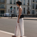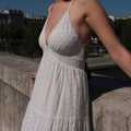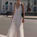 Sa coupe fluide, son dos nu à fines bretelles croisées et son décolleté profond, subtilement souligné par un anneau doré central, dessinent une silhouette aérienne et lumineuse.