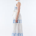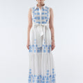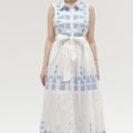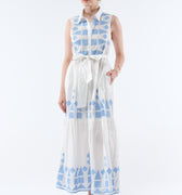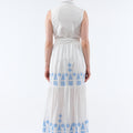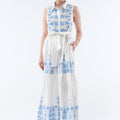 Fall for Romance, a shirt dress that combines comfort and style. Crafted from cotton and embroidered with geometric patterns, it features a flowing silhouette, classic collar, and full button placket. The tie belt delicately accentuates the waist, while the tiered skirt adds a touch of lightness. Perfect for sunny days or summer evenings, Romance is the ideal piece for a look that's both casual and refined.