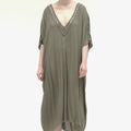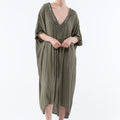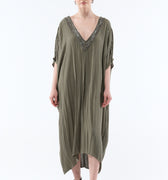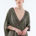 Fall in love with Aude, a viscose crepe caftan embellished with hand-embroidered beads, making each piece unique. Its loose fit and deep V-neckline offer a relaxed yet refined look, ideal for sunny days or more formal occasions.