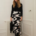 La jupe 63151 insuffle une énergie contemporaine avec son imprimé noir et écru aux lignes abstraites. Confectionnée dans une viscose fluide, elle épouse les mouvements tout en offrant un tombé structuré. Sa coupe longue fendue sur le côté apporte une touche de sensualité discrète, idéale pour moderniser une silhouette sobre.