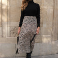Opt for Tissia, a midi skirt that perfectly combines elegance and boldness thanks to its leopard print and lace-trimmed slit. Crafted from viscose crepe, it offers a fluid and comfortable silhouette, ideal for adding character to your outfits, day or night.