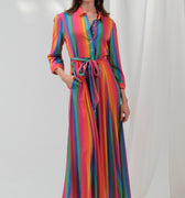 La robe Ima allie la structure classique d’une robe chemise à l’imprimé arc-en-ciel. Fluide, légère et ceinturée à la taille, elle sublime toutes les silhouettes avec élégance.
