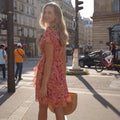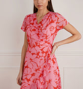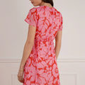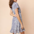 • Short wrap-over dress decorated with ruffles at the bottom of the dress