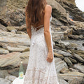 - The V-neckline is enhanced by a lace trim, adding a touch of femininity to this dress.