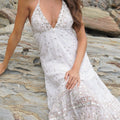 - The open back is adorned with delicate ties, each embellished with hand-embroidered details, offering a sophisticated and unique look.