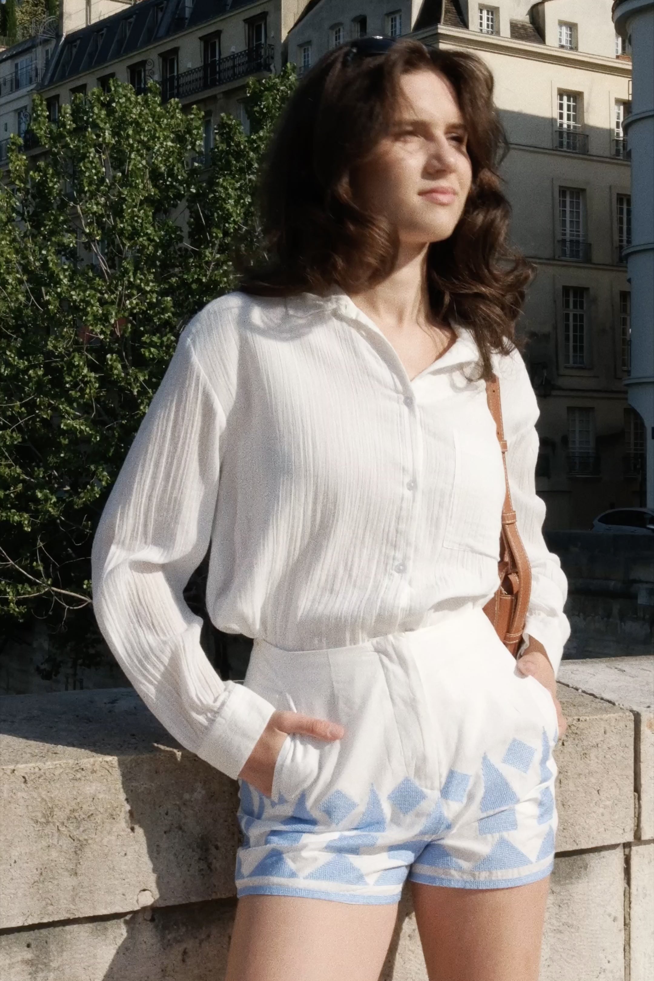 La chemise Junio incarne l’élégance décontractée des beaux jours. Confectionnée dans un coton léger et légèrement texturé, elle offre une sensation de fraîcheur tout au long de la journée. Cette pièce intemporelle est parfaite pour une silhouette à la fois structurée et aérienne, elle se porte aussi bien rentrée dans un bas que nouée sur le devant pour un effet plus casual.