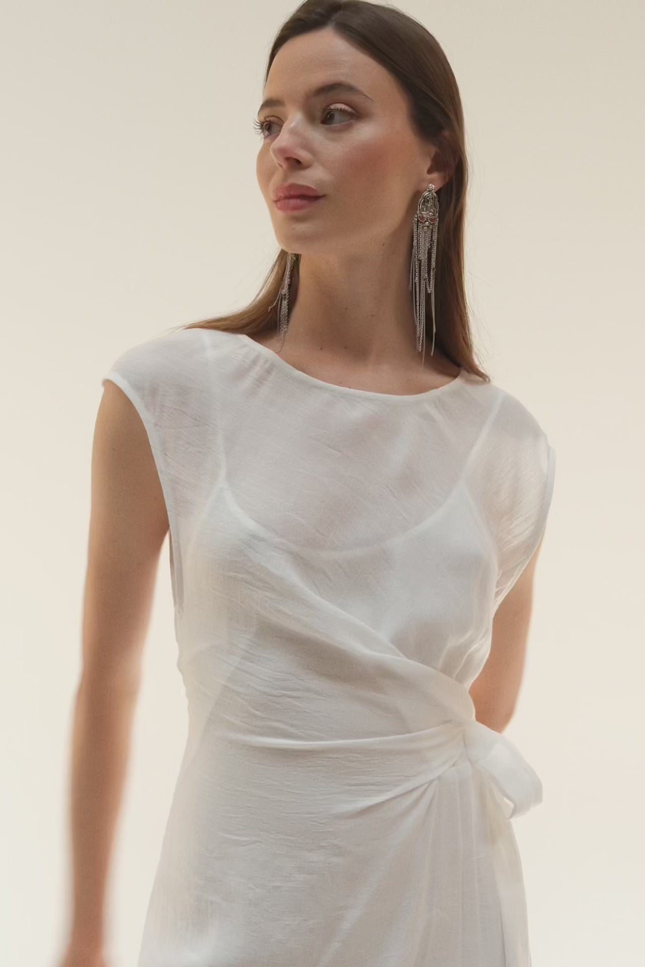 La robe longue 62818 écru séduit par son style épuré et sa coupe fluide à l’allure contemporaine. Son col bateau met délicatement en valeur les épaules, tandis que la taille est sublimée par un lien à nouer sur le côté pour un effet drapé raffiné. Léger et agréable à porter, ce modèle offre un tombé vaporeux parfait pour les beaux jours ou une soirée d’été.