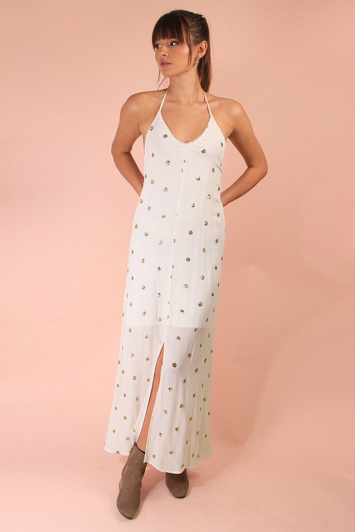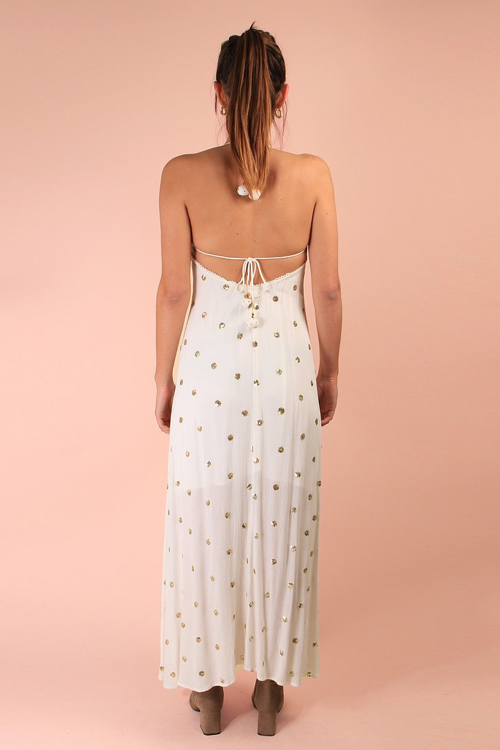 - Le dos est ouvert est maintenu par deux cordons en tissu orné de boule brodées de perles